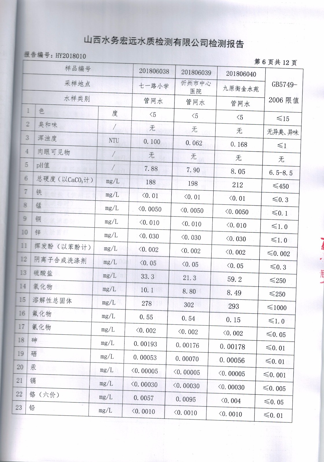 忻州城區(qū)公共供水水源水、出廠水、管網(wǎng)水、管網(wǎng)末梢水2018年6月份水質(zhì)信息公示