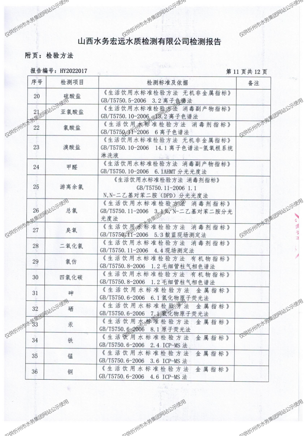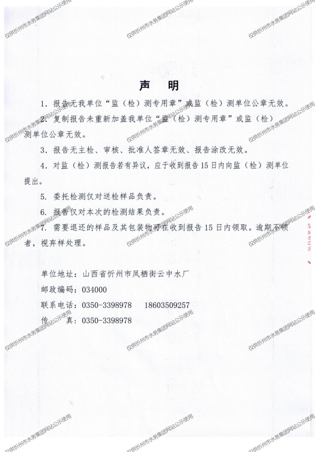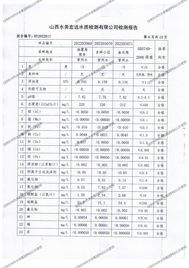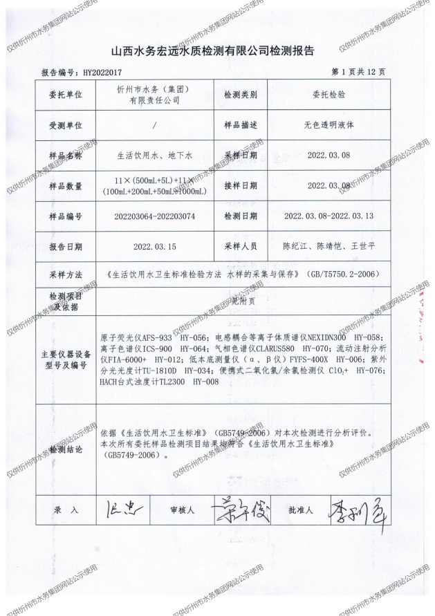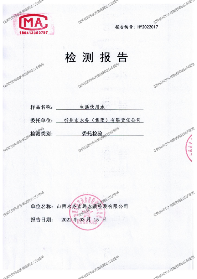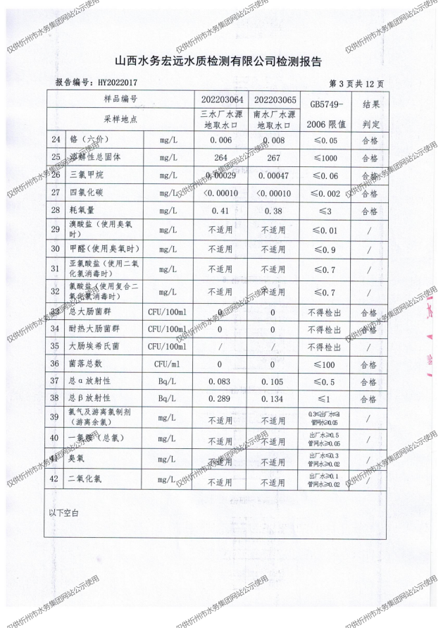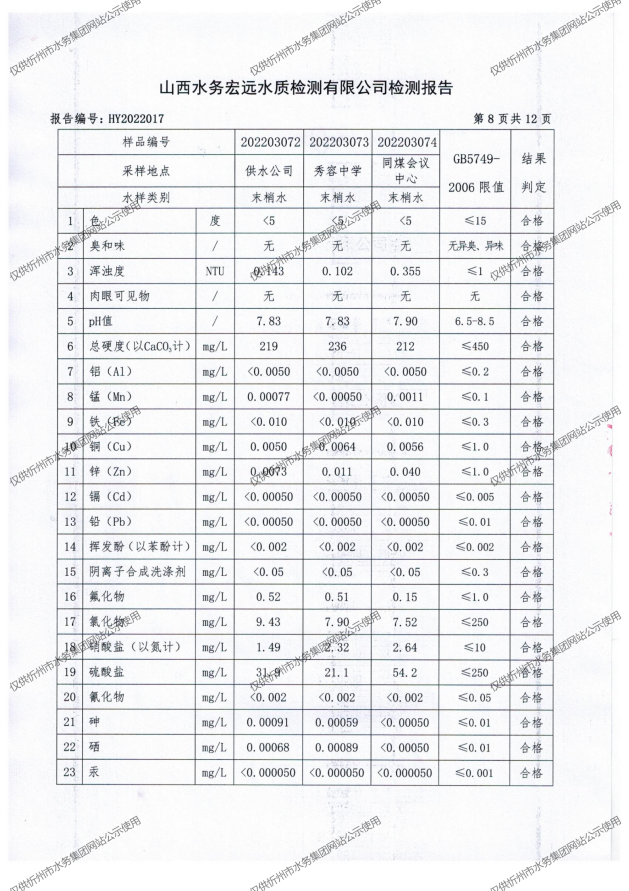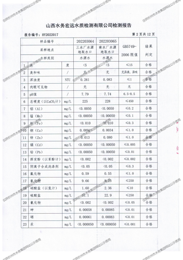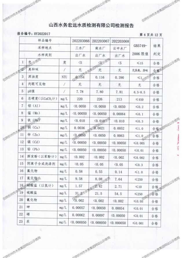 忻州城區(qū)公共供水水源水、出廠水、管網(wǎng)水、管網(wǎng)末梢水2022年3月份水質信息公示